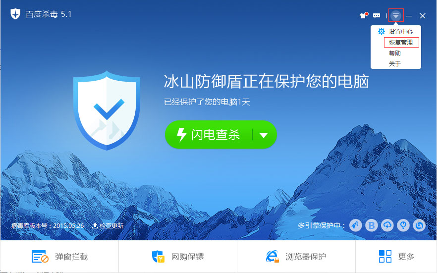 点击右上角“向下小箭头”选择“恢复管理”,进入后,切换到“信任区”,将“银天下防挟持器.exe”文件,加入信任列表。