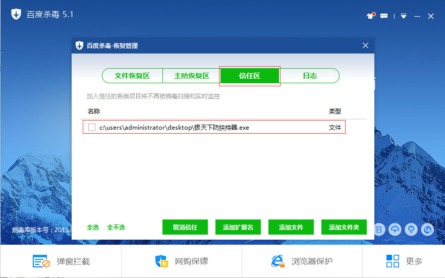 四、杀毒程式、安全卫士等 误删压缩包或EXE文件:只需将“银天下防挟持器.exe”添加进入信任列表即可,详细如下: