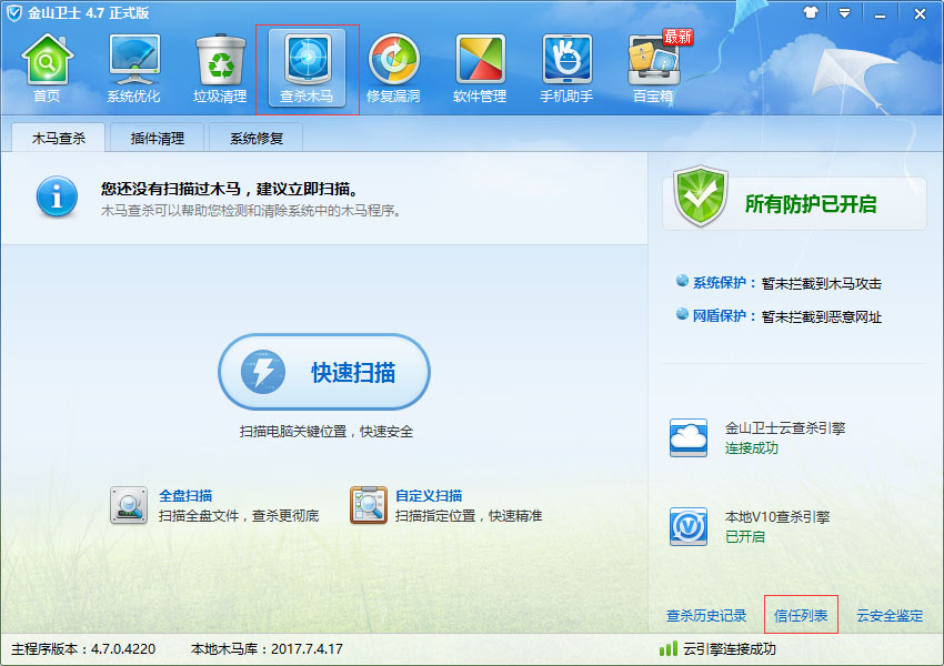 选择 “木马查杀”功能,进入后,在左下角有 “信任区|恢复区|上报区”。点击选择 “信任区”,将“银天下防挟持器.exe”文件,加入信任列表。