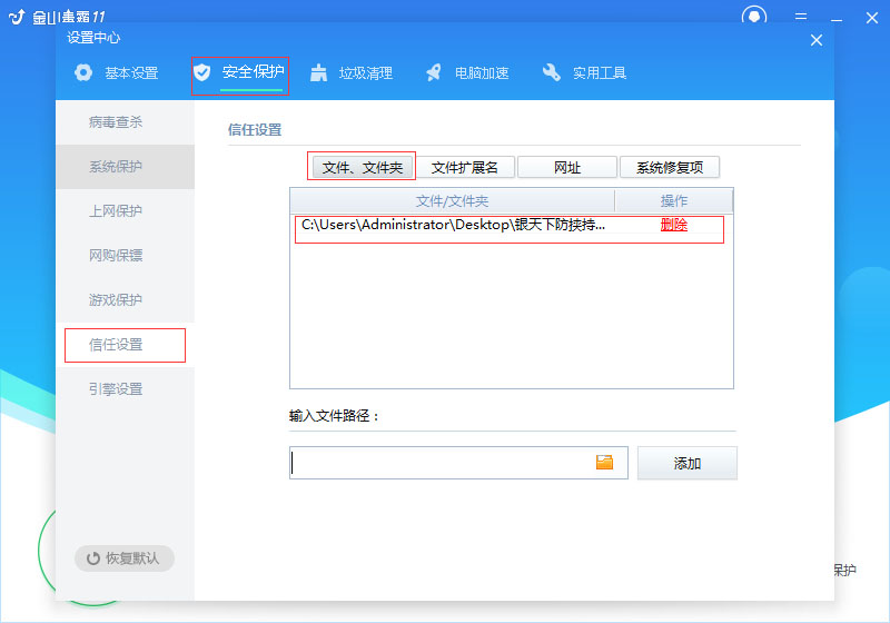 点击右上角“菜单”图标,选择“设置中心”,进入后,切换到“安全保护”的“信任设置”,在文件/文件夹那里将“银天下防挟持器.exe”文件,加入信任列表。